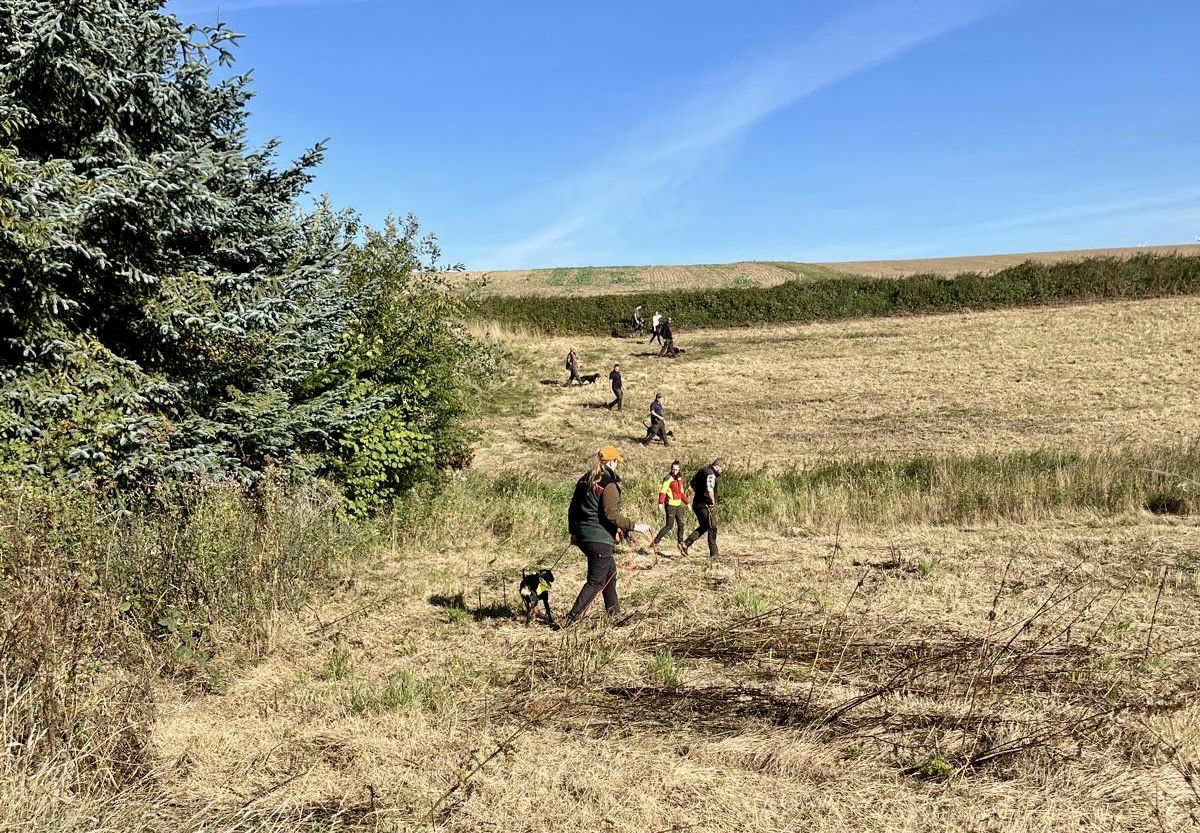 Nachdem alle eingetroffen waren, sich begrüßt und vorgestellt haben, wurden die Hunde zum Durchgehen fertiggemacht. Die Hundeführer mit Bracken nahmen das Treiben auf, unterstützt durch den Einsatz einer Drohne. Über Funk konnte jederzeit Verbindung gehalten werden.