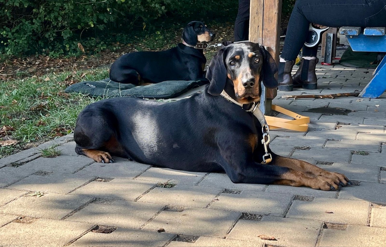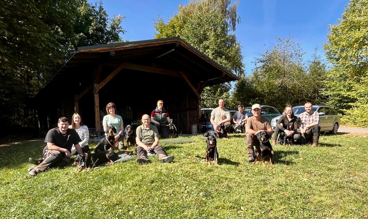 Lattenberg. Am Freitag, den 13.6.2025 trafen sich bei schönstem Sommerwetter 15 Hundeführer mit ihren Vierläufern. Dabei waren neben Steirischen Bracken und Brandlbracken auch eine Deutsche Bracke sowie eine Westfälische Dachsbracke. Nach einer freundlichen Begrüßung durch die Regionalbeauftragten Jürgen Hecking und Christian Pietz wurden wir in fünf Gruppen eingeteilt und es ging direkt los. Armin Lobscheid erklärte in einem informativen und kurzweiligen Vortrag die Grundlagen der Schweißarbeit und dann ging es mit den Übungsgruppen in den Wald. Jedes Gespann durfte bereits am Freitag eine kurze Fährte arbeiten, um die Hunde kennenzulernen. Im Anschluss wurden die Fährten für den nächsten Tag getreten, dabei wurden sowohl in Fährtenlänge als auch in der Schwierigkeit der einzelnen Fährte die individuellen Voraussetzungen der jeweiligen Hunde berücksichtigt. Zum Abschluss des Tages trafen sich (fast) alle Seminarteilnehmer im nahegelegenen Gasthaus zu einem gemütlichen Abendessen und Zusammensein. Weiter ging es dann am Samstagmorgen.